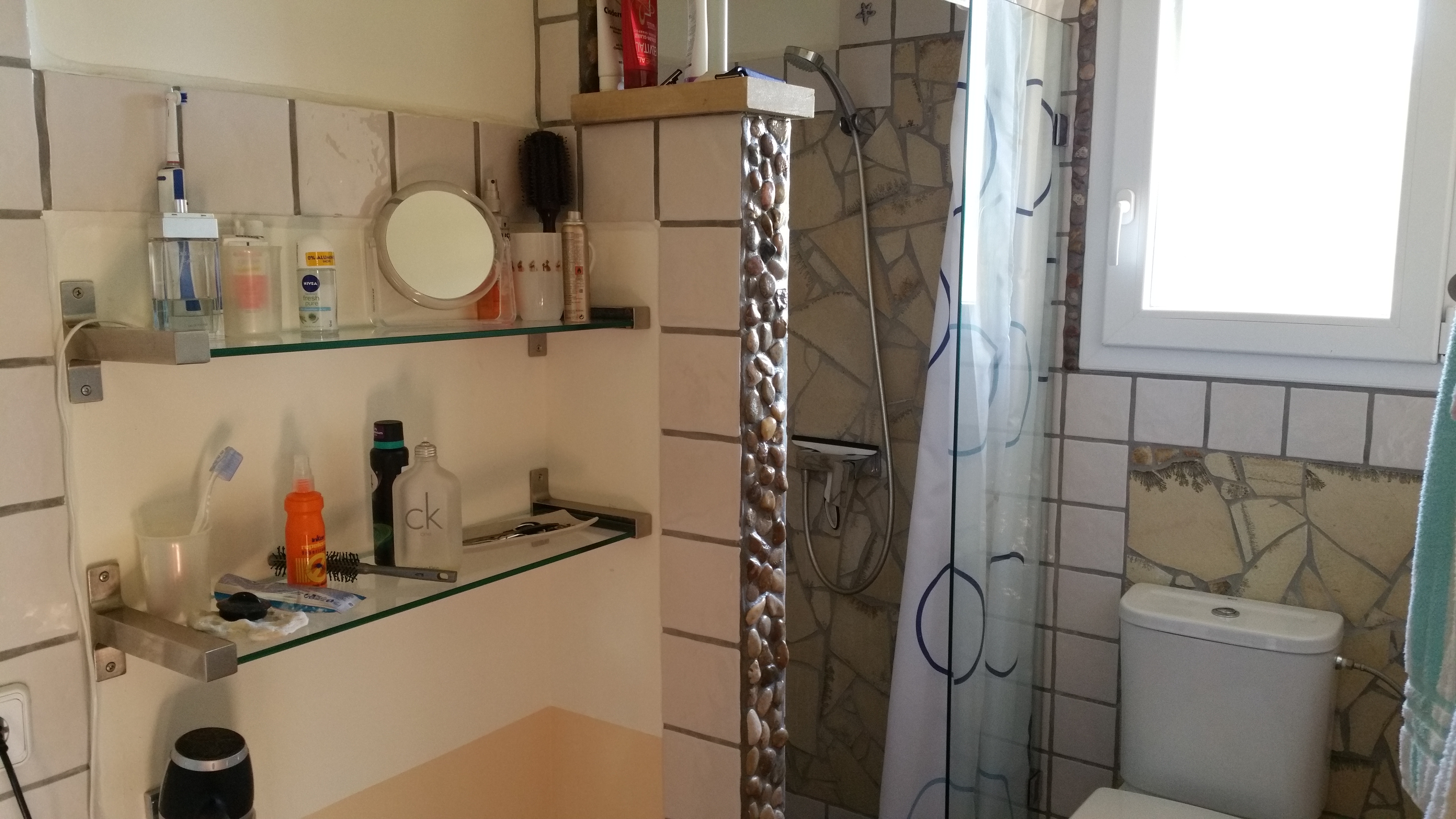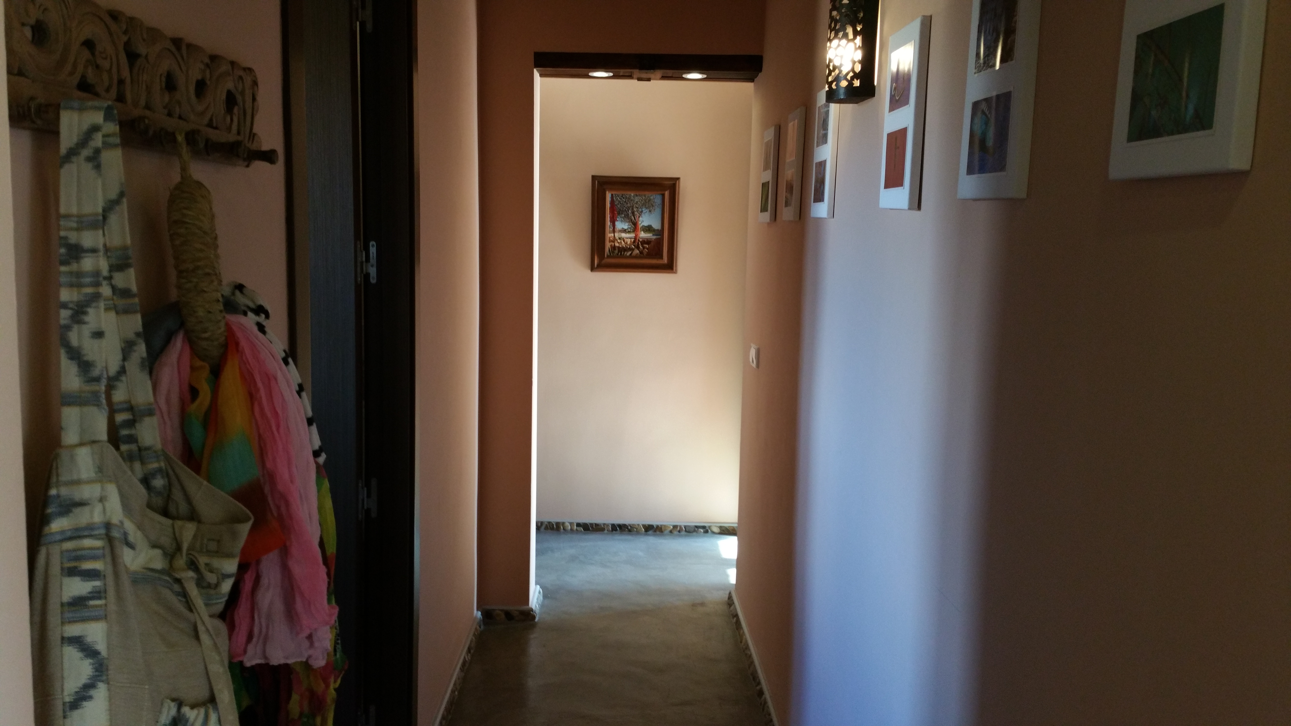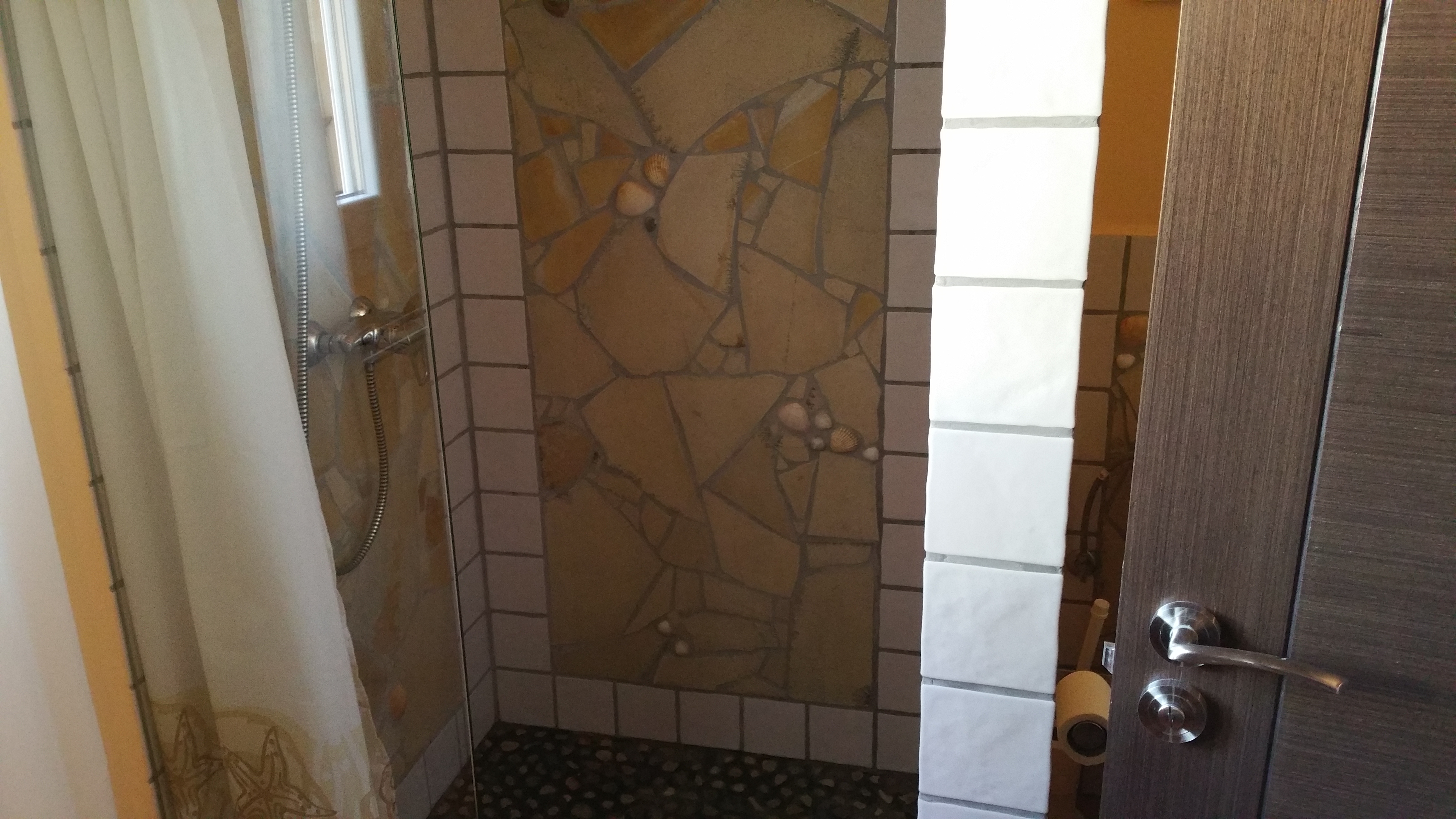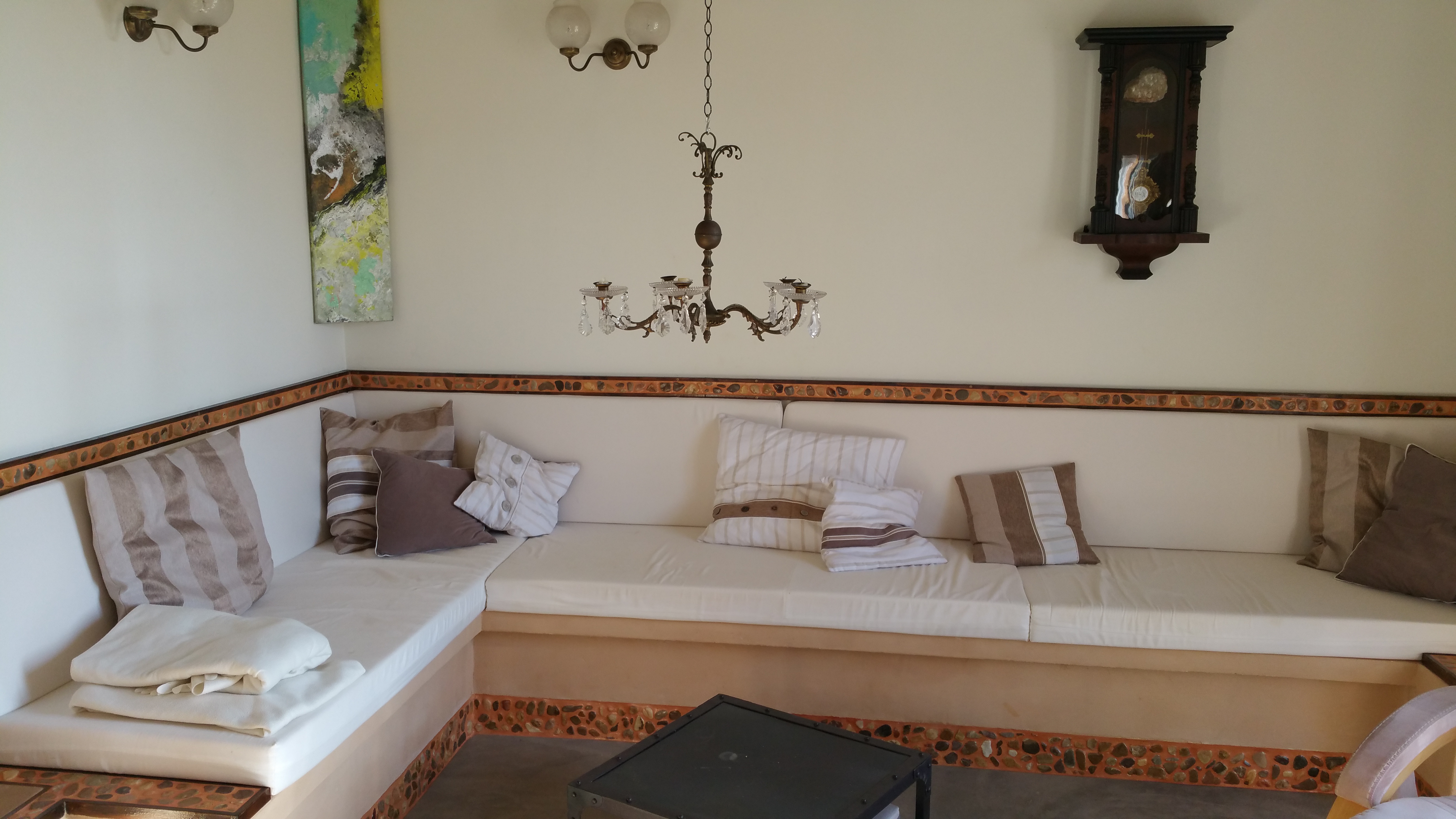 Die Böden sind im schicken Zier-Estrich mit Kies-Einlagen handgefertigt, auch die Bäder sind individuell mit Kies- und Muscheleinlagen gestaltet.